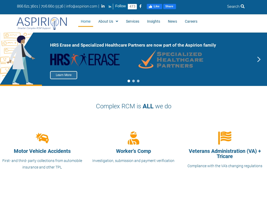 Since 2008 Aspirion has offered a growing array of RCM services for hospital physcian group and provider systems looking for better results in managing their most complex reimbursements. We specialize in Motor Vehicle Accidents Workers Compensation Veterans Administration and Tricare Complex Denials Out-of-State Medicaid and Eligibility and Enrollment Services. Most medical providers do not have the expertise or resources to collect everything they are owed on these claims.
