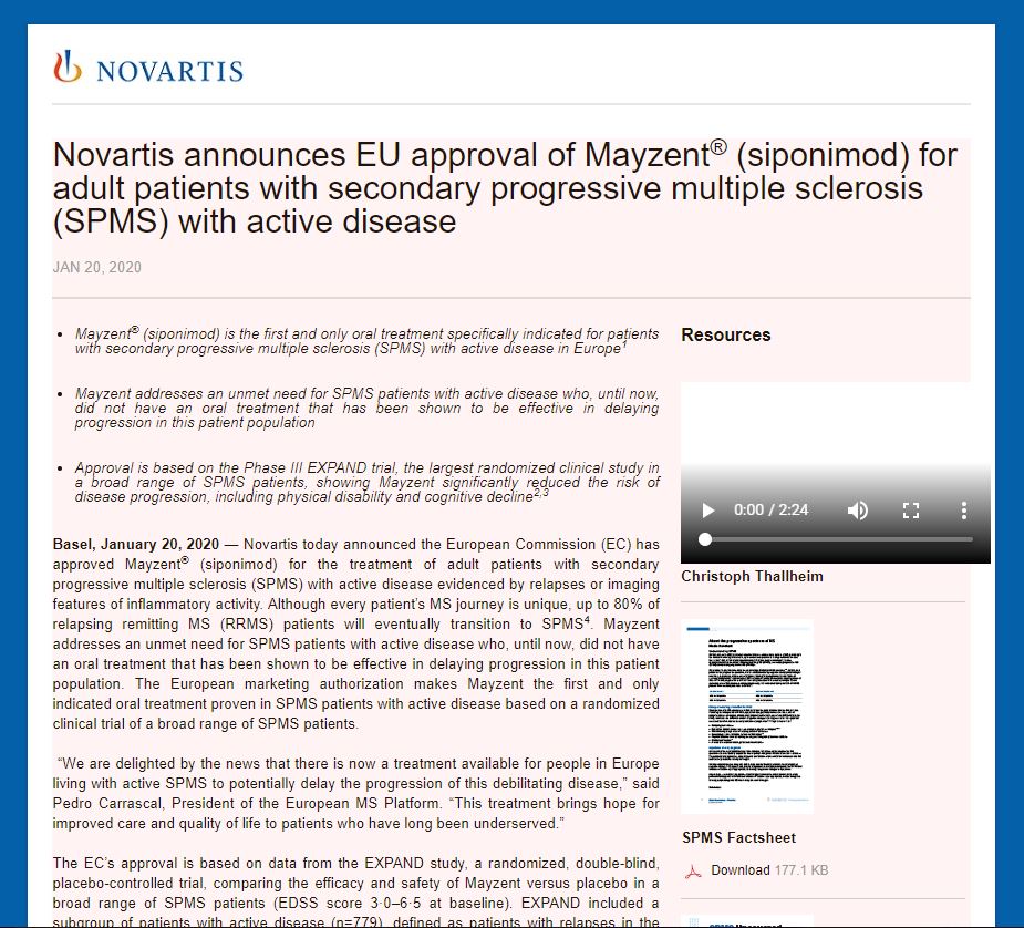 Novartis Announces Eu Approval Of Mayzent Siponimod For Adult Patients With Secondary Progressive Multiple Sclerosis Spms With Active Disease Novartis